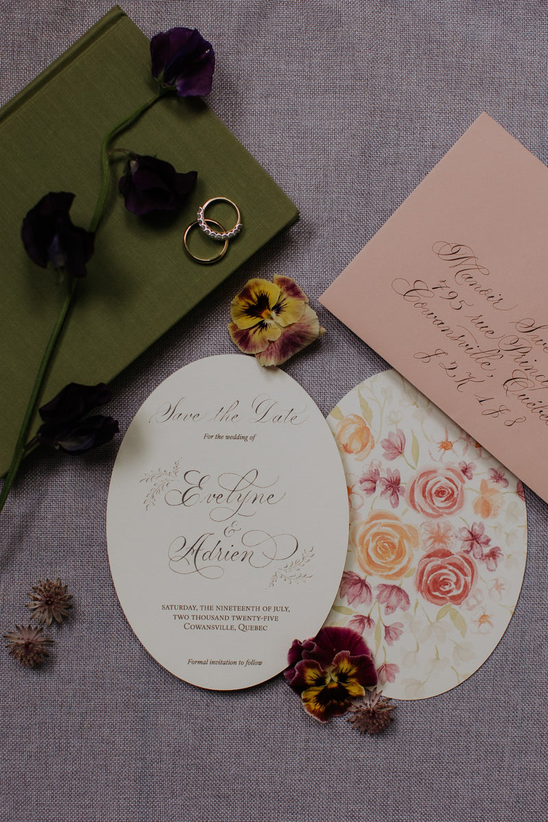 Invitations de mariage sur différents types de papier, impression et découpe numérique, calligraphie de style romantique.