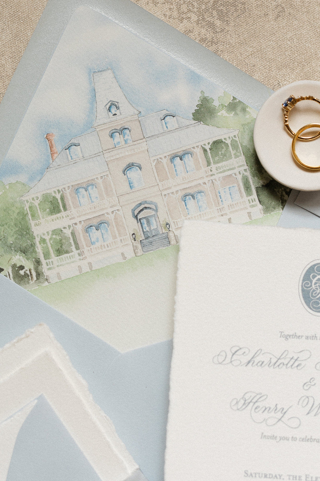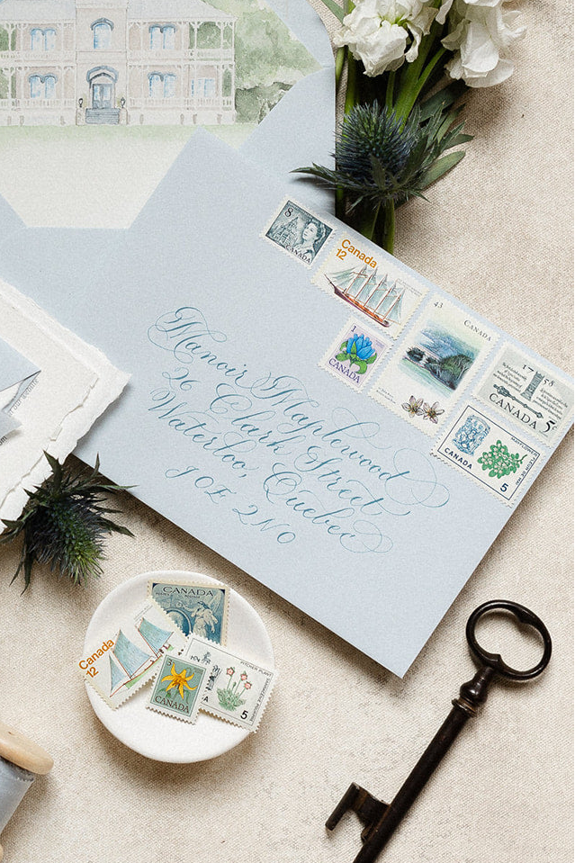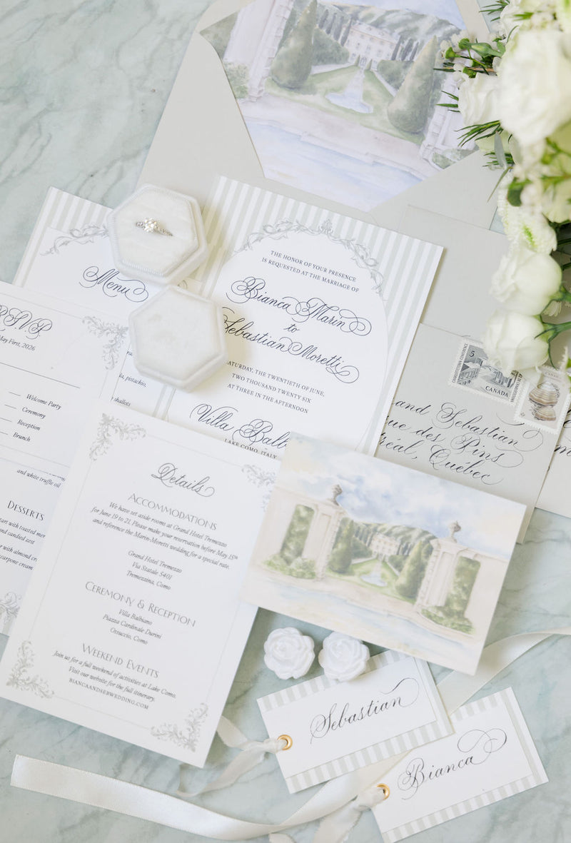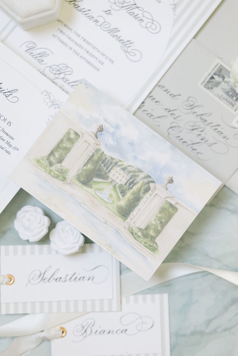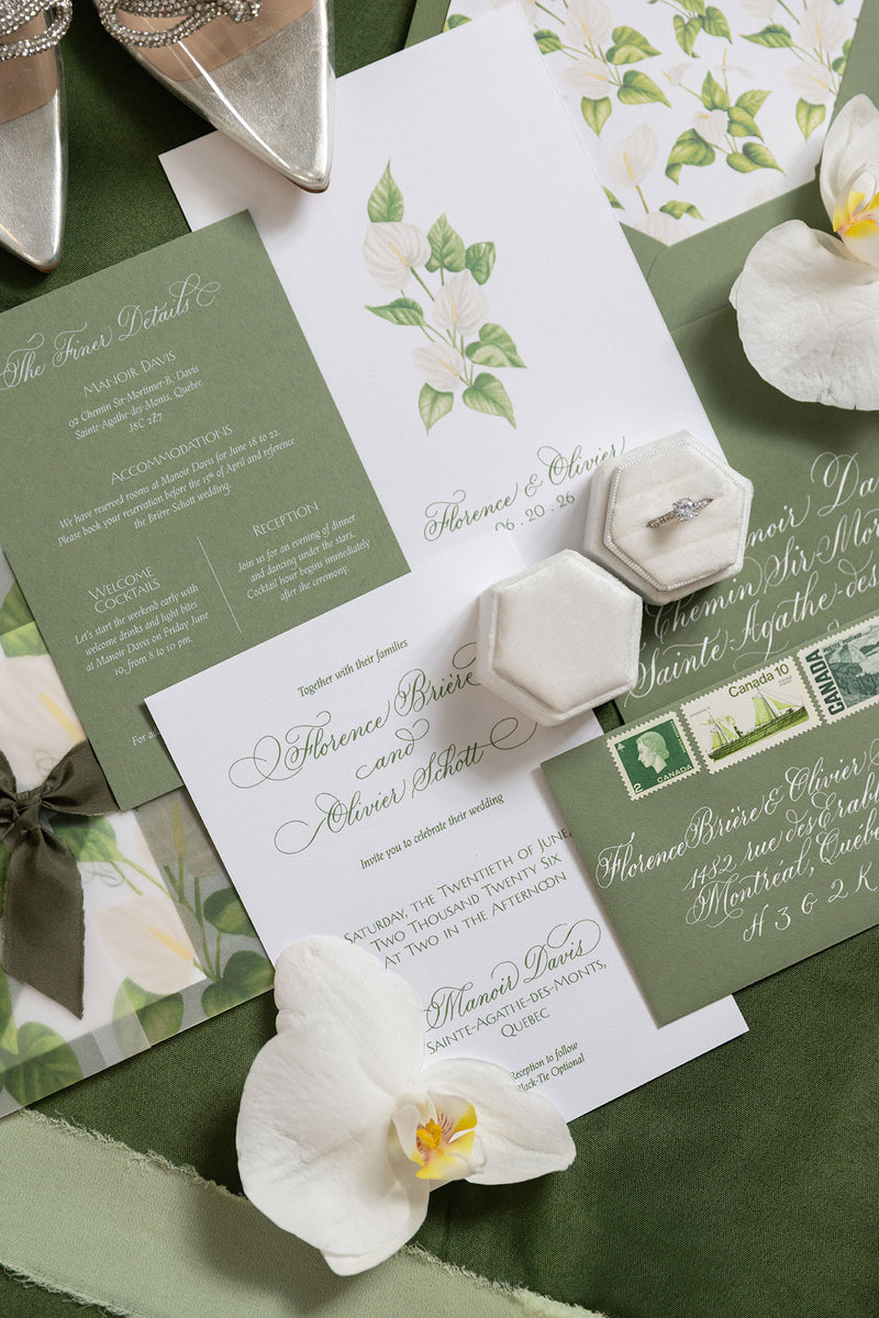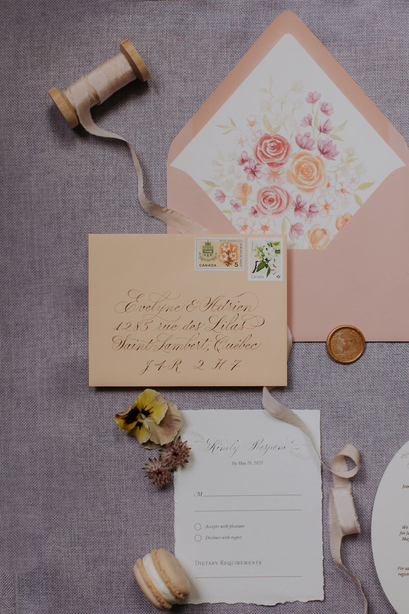 Invitations de mariage : impression numérique sur papier aquarelle avec calligraphie classique.