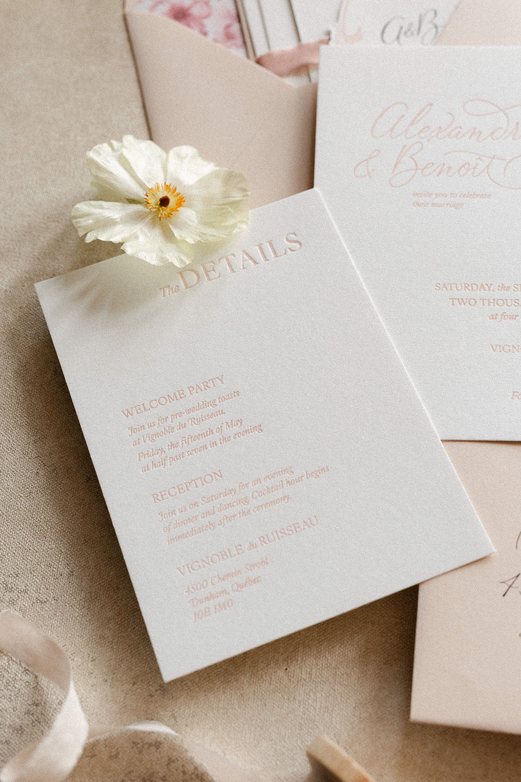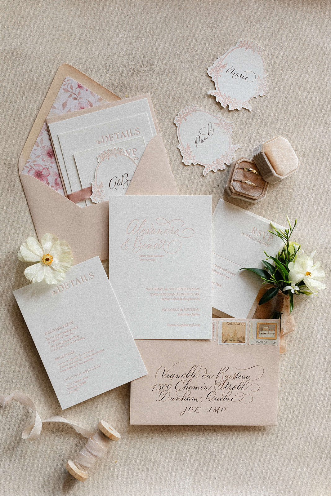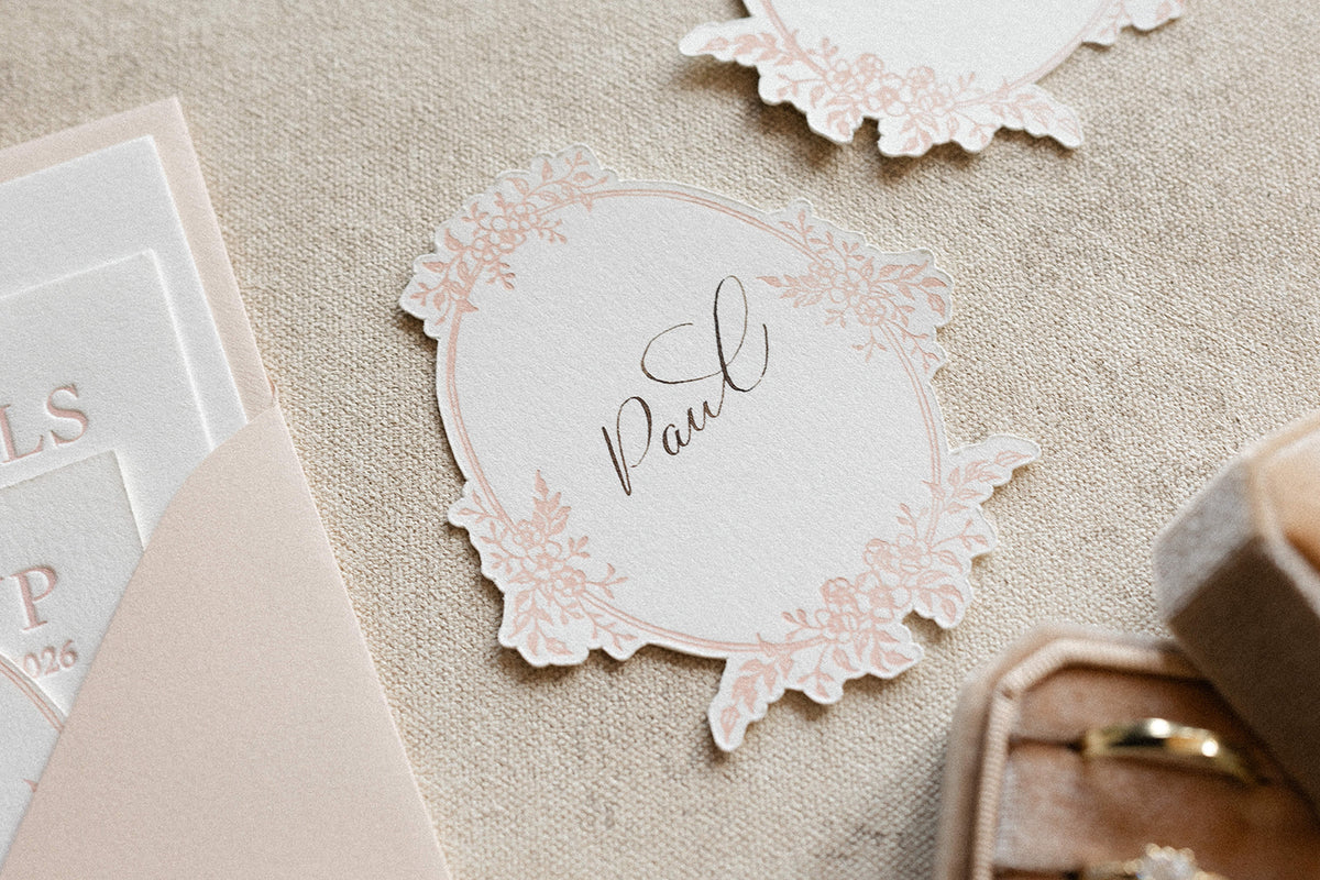 Invitations de mariage avec impression letterpress sur papier de coton et calligraphie moderne.